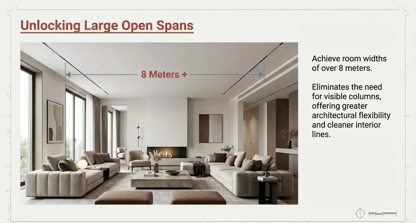 room widths of over 8 meters without the need for visible columns.