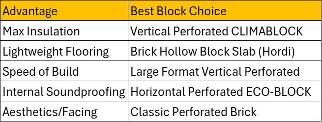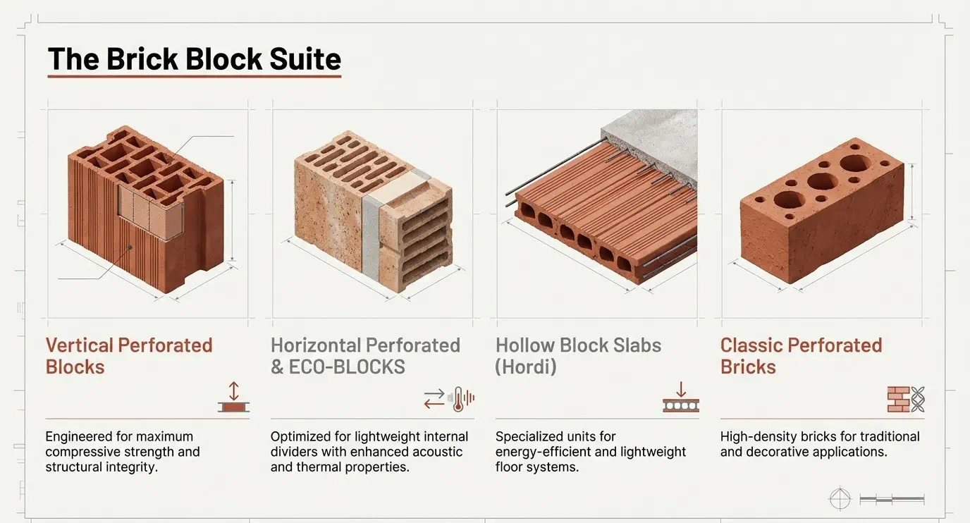 Horizontal Perforated & ECO-BLOCKS: Optimized for lightweight internal dividers with enhanced acoustic and thermal properties.